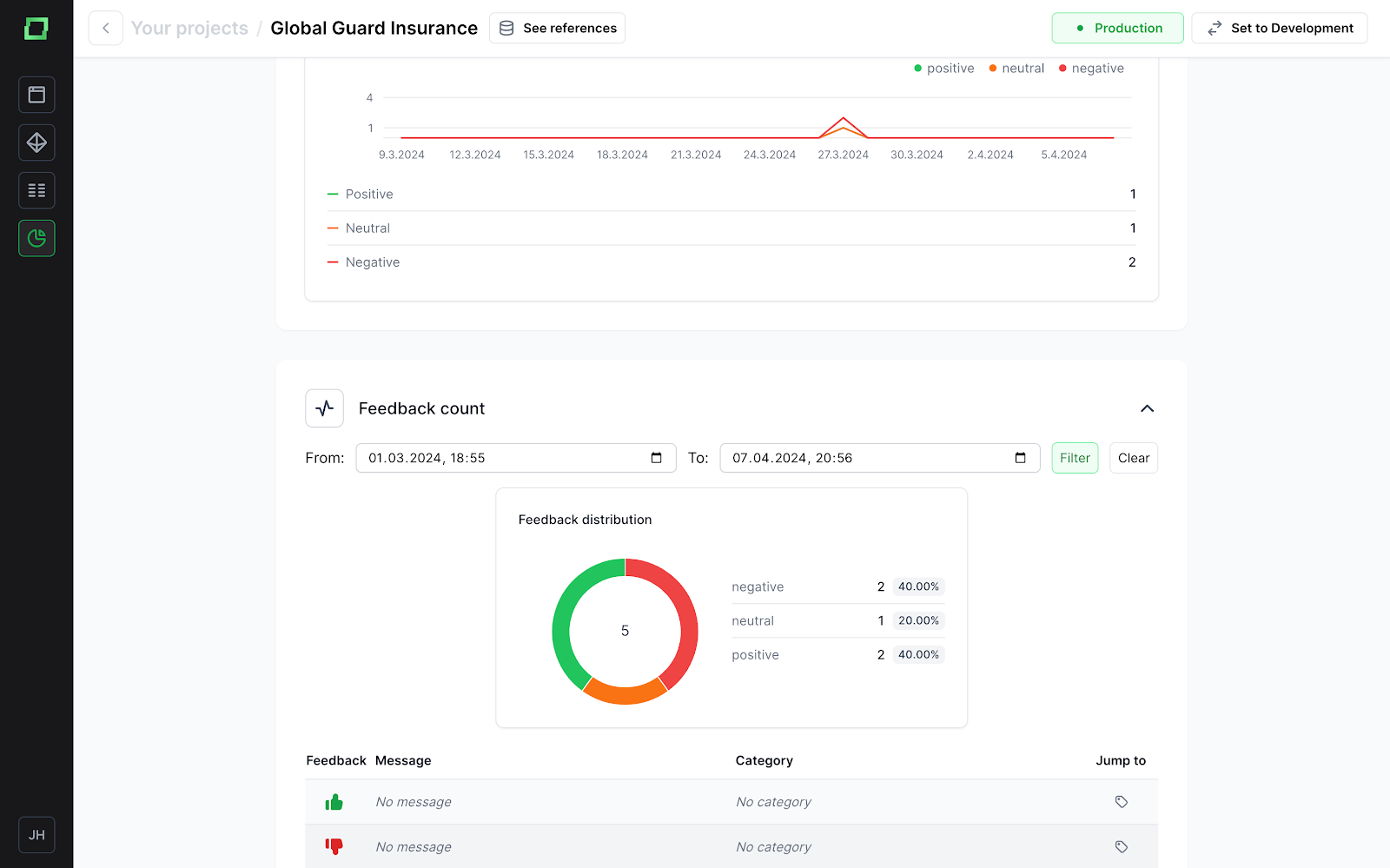 One of the key features of cognition is the ability to analyze the quality of your GenAI agents. It must be reliable and trustworthy in order to be helpful enough to be of actual use. When annotators use the agent and provide feedback via the feedback system, you can view the results in your dashboard. This is e.g. helpful to understand if and how the agent got better over time and how feedback changed.