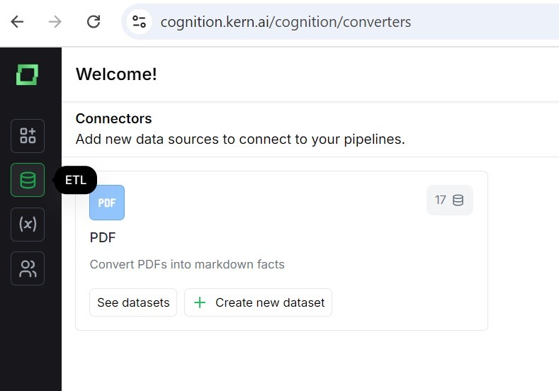 To begin processing, first create a dataset where you can upload your files. On the left-hand side of the Cognition home page, there is a sidebar. Click “ETL” and then “Create new dataset”. To find an existing dataset, click “See datasets”.As part of the table, the engineer can see the configuration of the dataset.
