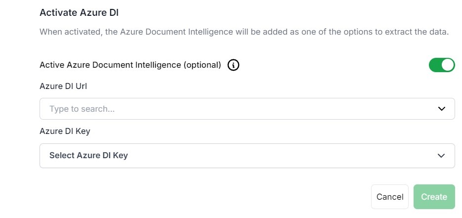 If you want to use Azure DI as an extraction method, activate it with the corresponding credentials. The Azure DI requires api key and Azure DI Url.