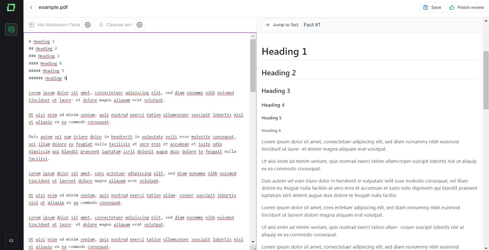 Tables should also be reviewed. While it is not essential for tables to look exactly like the original, the content should be clear, and rows should be processed correctly. The information will still be useful as plain lines. If you prefer tables, you can convert plain lines into Markdown tables. Select the lines you want to convert and click “Into Markdown-Table” at the top left of the page.