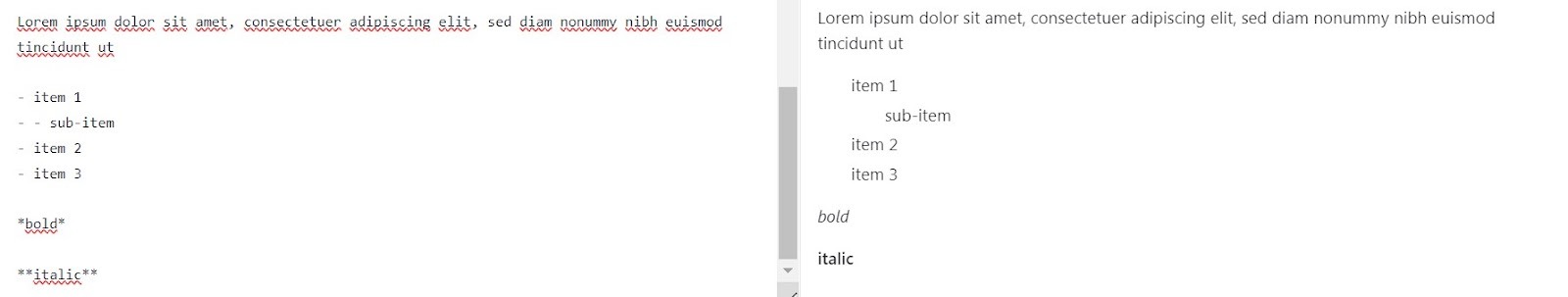 To create a list, write - followed by a space. To add subitems, use double dashes with a space in between, like this: - -. To make a word bold, write it between two **. To italicize a word, use only one *. To create an empty line, press Enter twice.