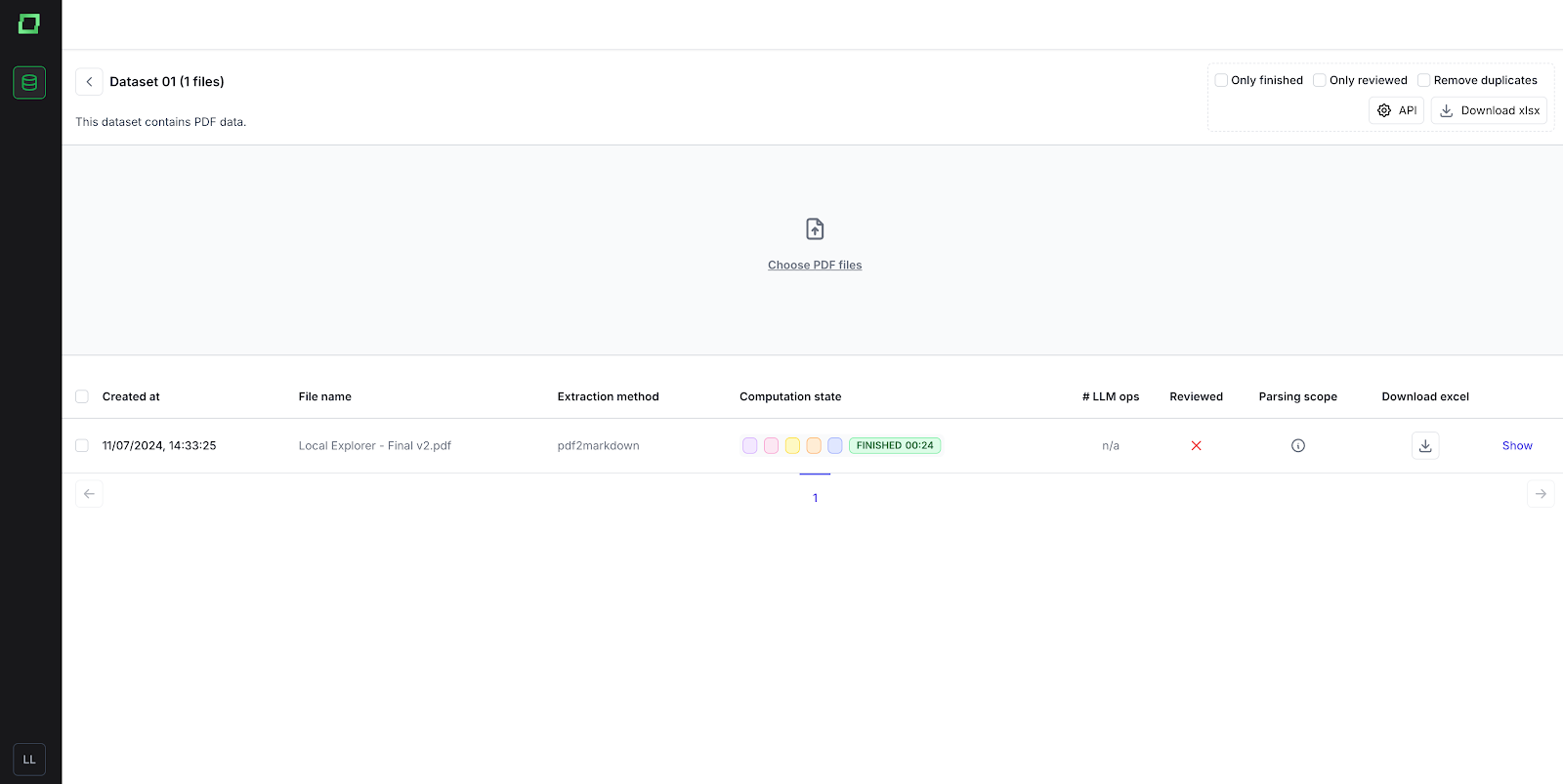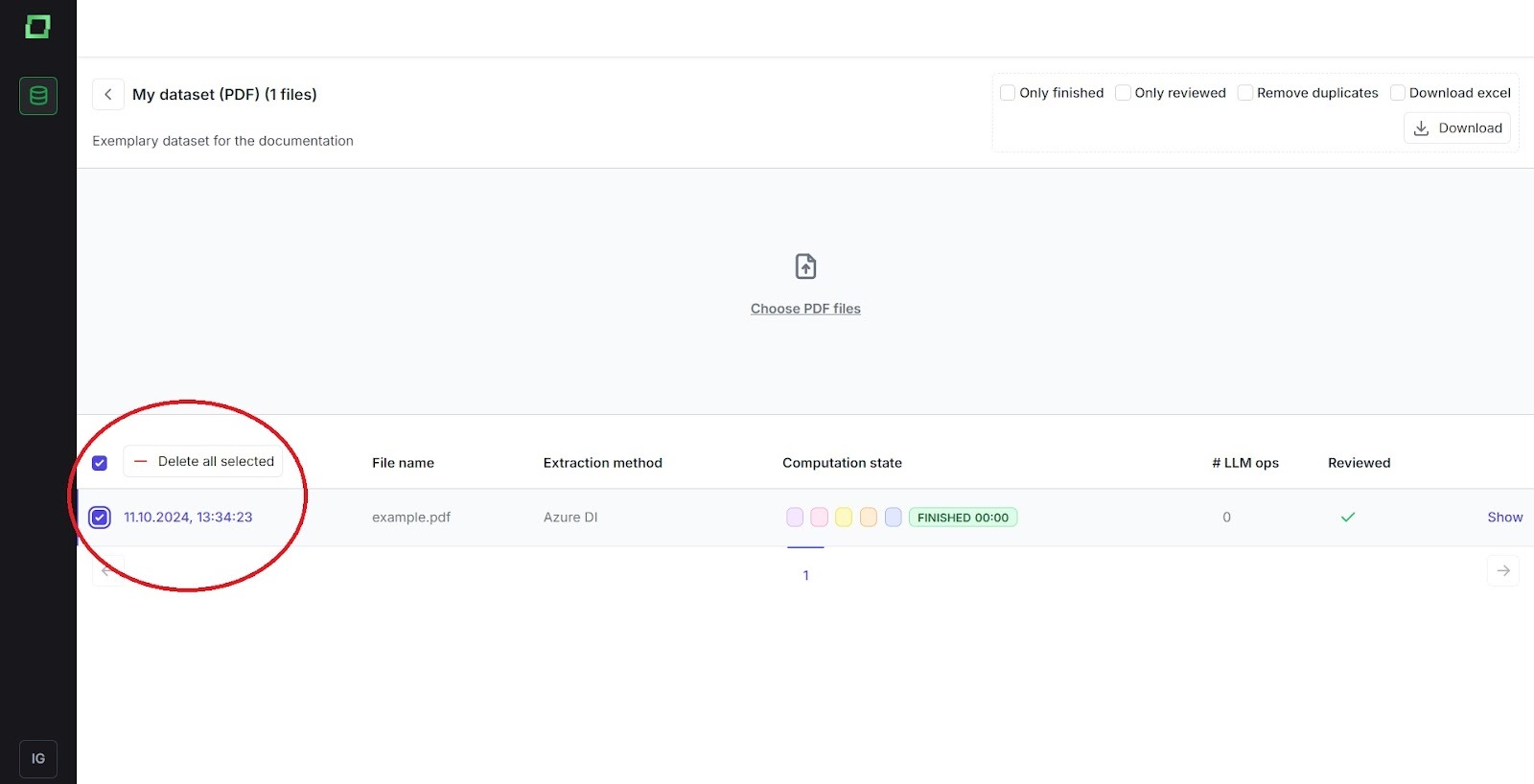 You can filter the files that you want to download. You can download only finished (didn’t fail in the pipeline), only reviewed or both. When using these options, the files will be downloaded as .csv files. If you apply the “Download excel” filter, the files will be downloaded as Excel files.