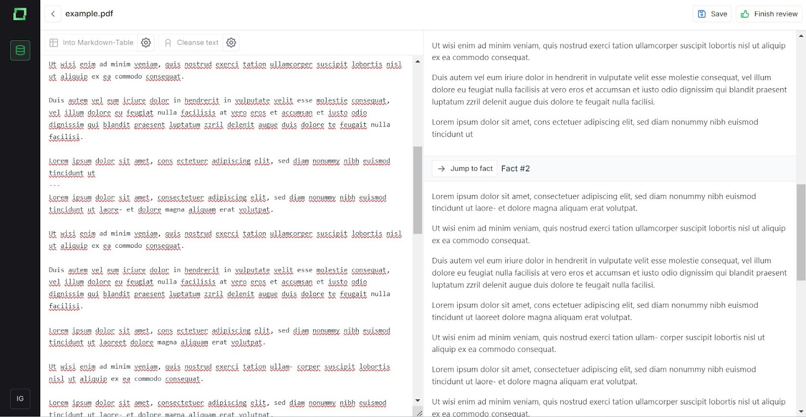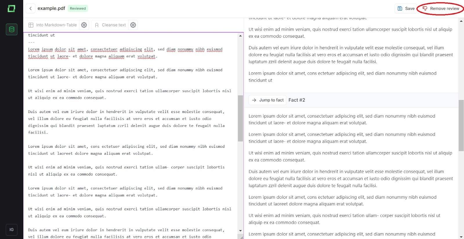 First thing to check in a processed document is whether there are any unwanted special characters. Some images or symbols may be incorrectly processed and cause unwanted characters, such as “⍰”. These should be deleted, because they make it difficult for an LLM to interpret the text and also consume additional tokens, increasing costs. You can use the "Cleanse Text" option at the top left of the page. To use this function, you need to select the target area first.
