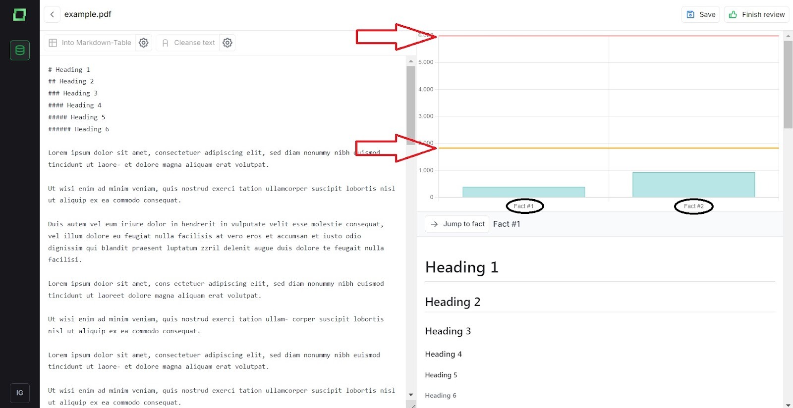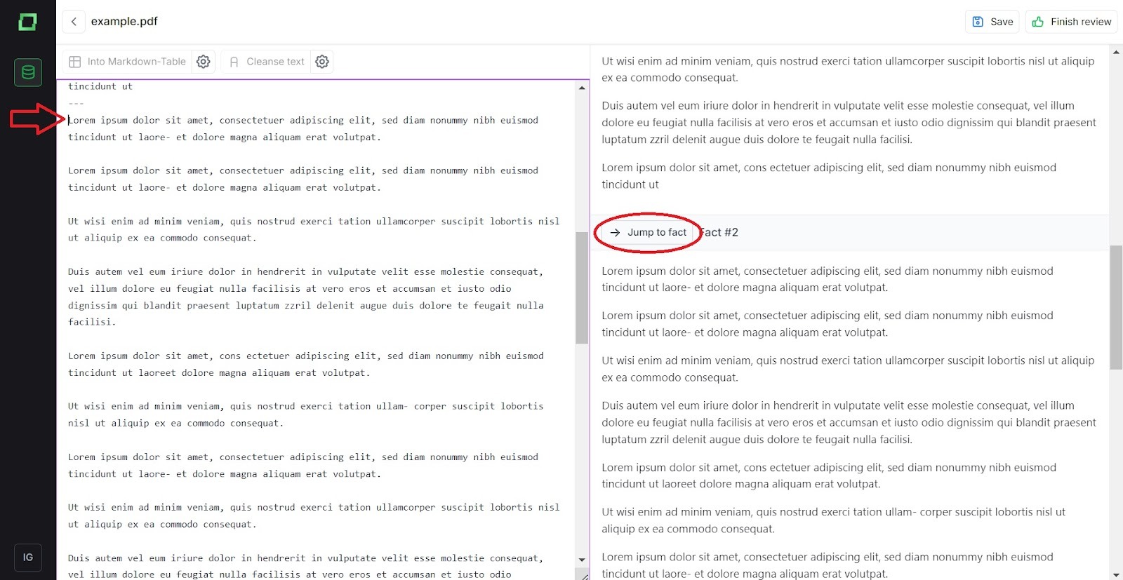 To jump to a chunk directly, you can click to its corresponding fact. If you click on “jump to fact” on the right-hand side, the left-hand side directly goes to its respective chunk. To search a section or word, you can use the usual Ctrl+F search function.