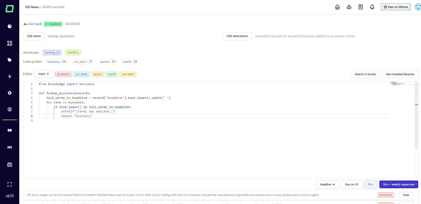 Fig. 4: Screenshot of the labeling function details page where the user finished writing the labeling function. It imports a lookup list called 'business' and looks for any of these terms in the headline attribute in order to return the label 'business'. This could be extended to look for a minimum threshold of matching terms to increase accuracy.