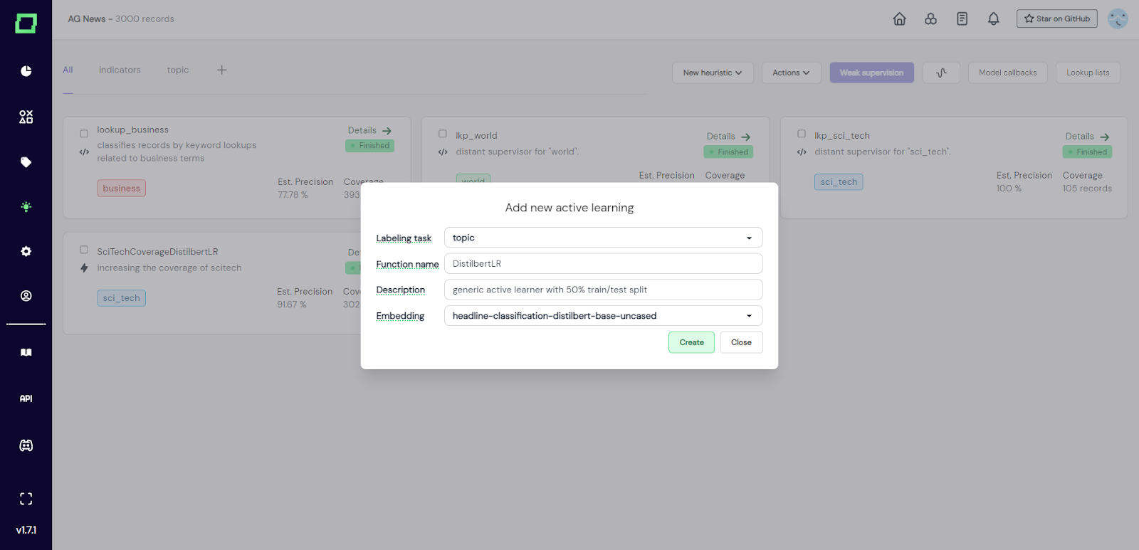 To create a labeling function simply navigate to the heuristics page and select "Active learning" from the "New heuristic" button.