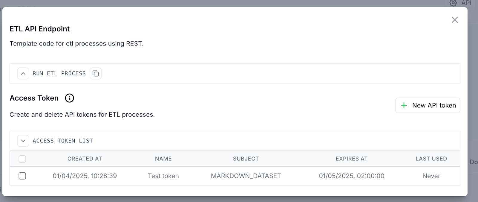 Another option for running the ETL pipeline is through the API, which allows you to execute the pipeline and collect results without using the application's UI. The provided code snippet requires custom configurations, including the API key/token, file path, and extraction method. Tokens can be generated within the application, with customizable expiration options (1 month, 3 months, or never). It is important to securely store the token value, as it will not be visible in the table once created.